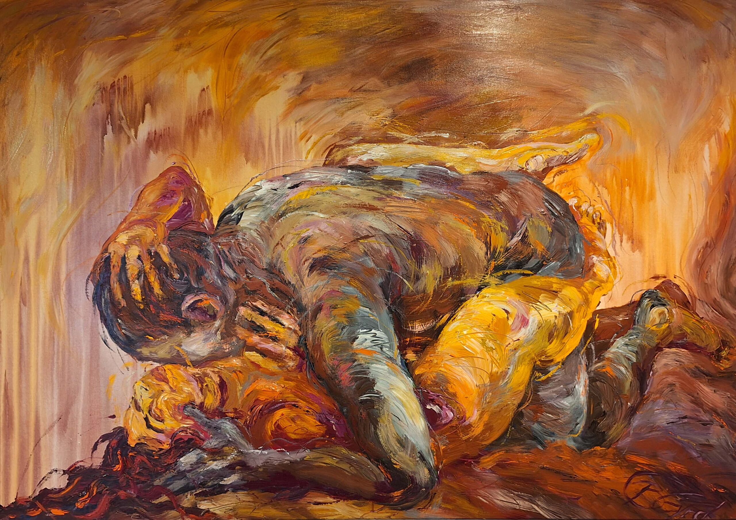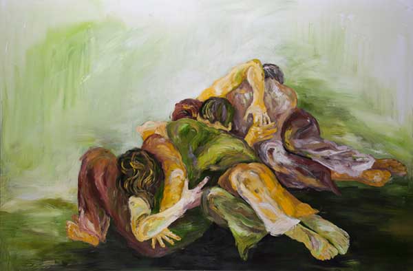 Kærtegn og kram – kvinden har fået al farven – i dyreriget er det hannen. Nydelse i kærlig treenighed i medglædens tegn. Eros på besøg blandt par i brændende palet. Inspiration fra modeller i atelieret og egne sanseoplevelser.