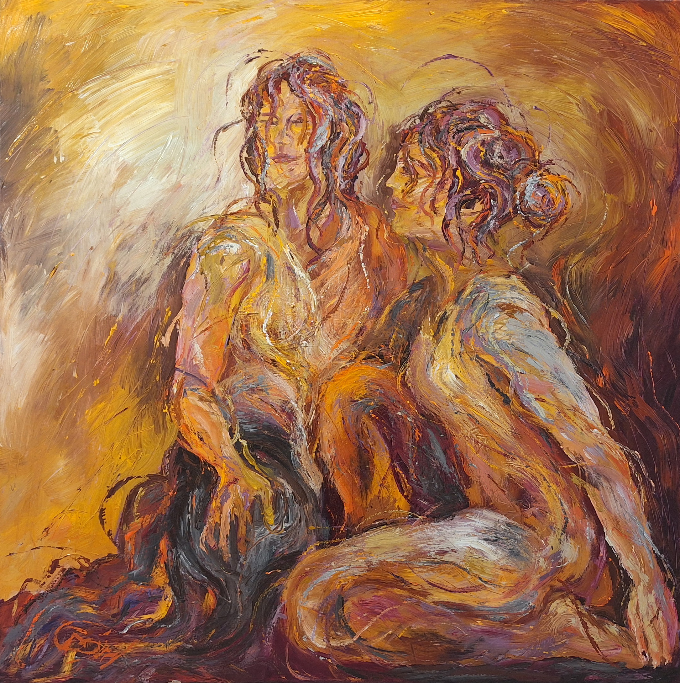 Sensuel sanselighed i gyldne toner – solen der varmer kroppene – sommerens stråler favner glæden mellem sjæle. Inspiration fra modeller i atelieret og egne oplevelser.