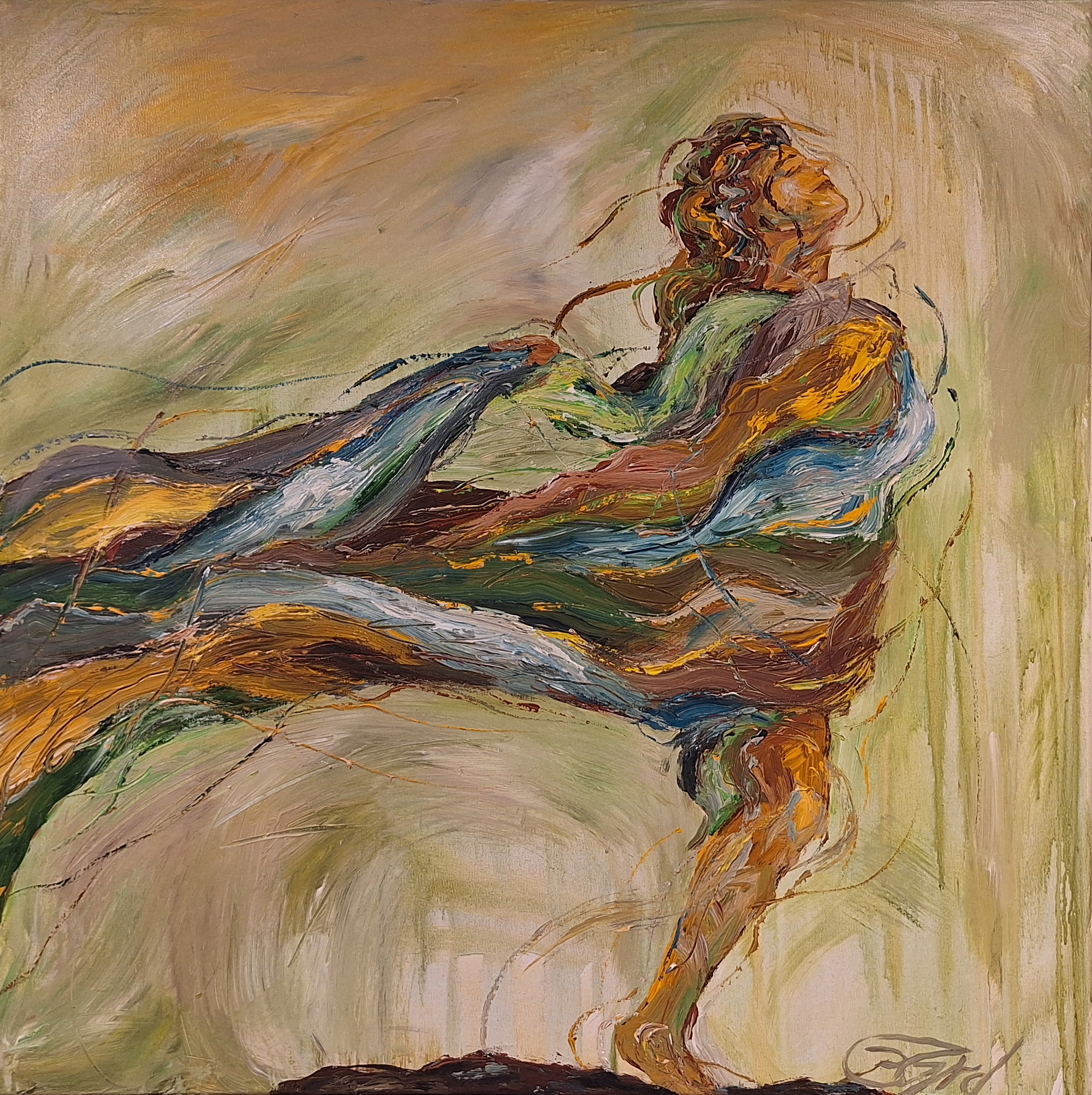 Kobberbaggrunden får kvinden til at træde lysende frem i hendes glæde ved dansen i nuet – kunstnerinden har selv været på opdagelsesrejse i syden ind i sigøjnernes stærke smukke dans. Dette er seks selvportrætter.